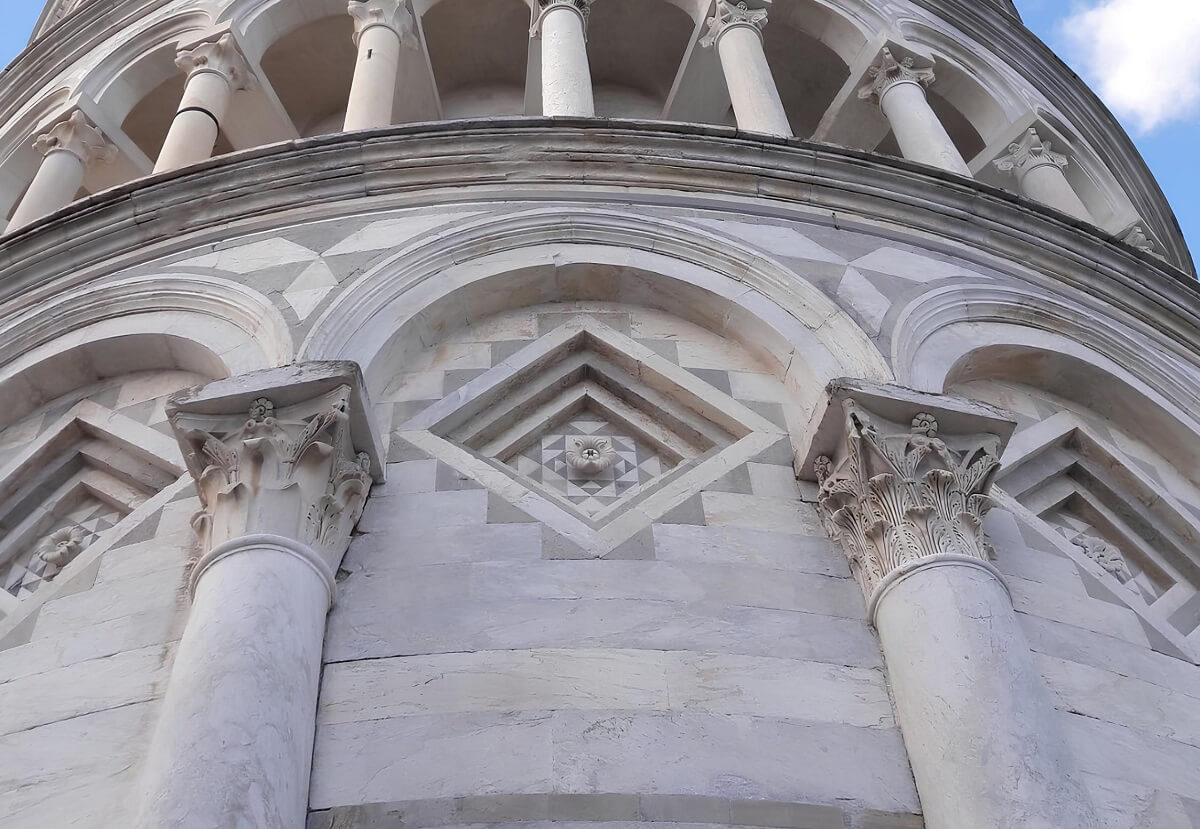 Dekorative Elemente der Fassade des Schiefen Turms von Pisa